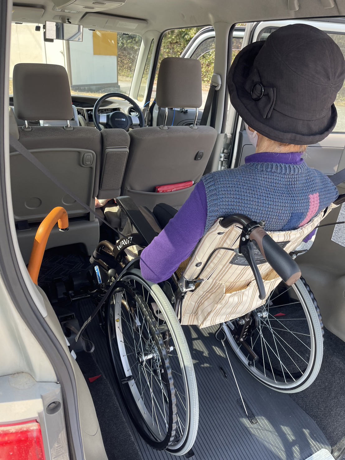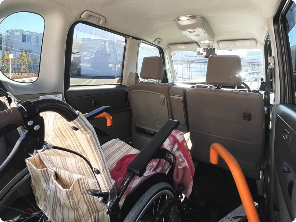 ご指定のお時間にお伺いし、車椅子の方にはスロープで安全に乗車いただきます。車椅子がご不要な方は、通常のシートへご案内いたします。